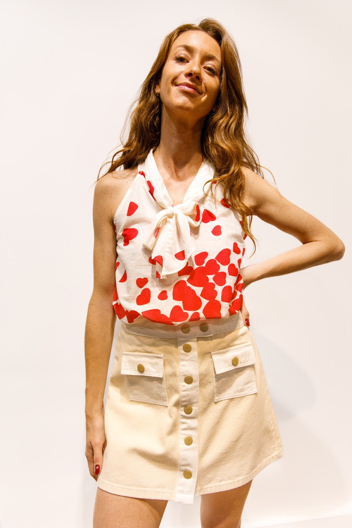 Flirt, le top sans manches en coton à imprimé cœurs, avec col à nouer façon foulard qui dégage joliment les épaules. Sa coupe légère et son encolure travaillée apportent une allure féminine et fraîche, idéale pour les beaux jours.